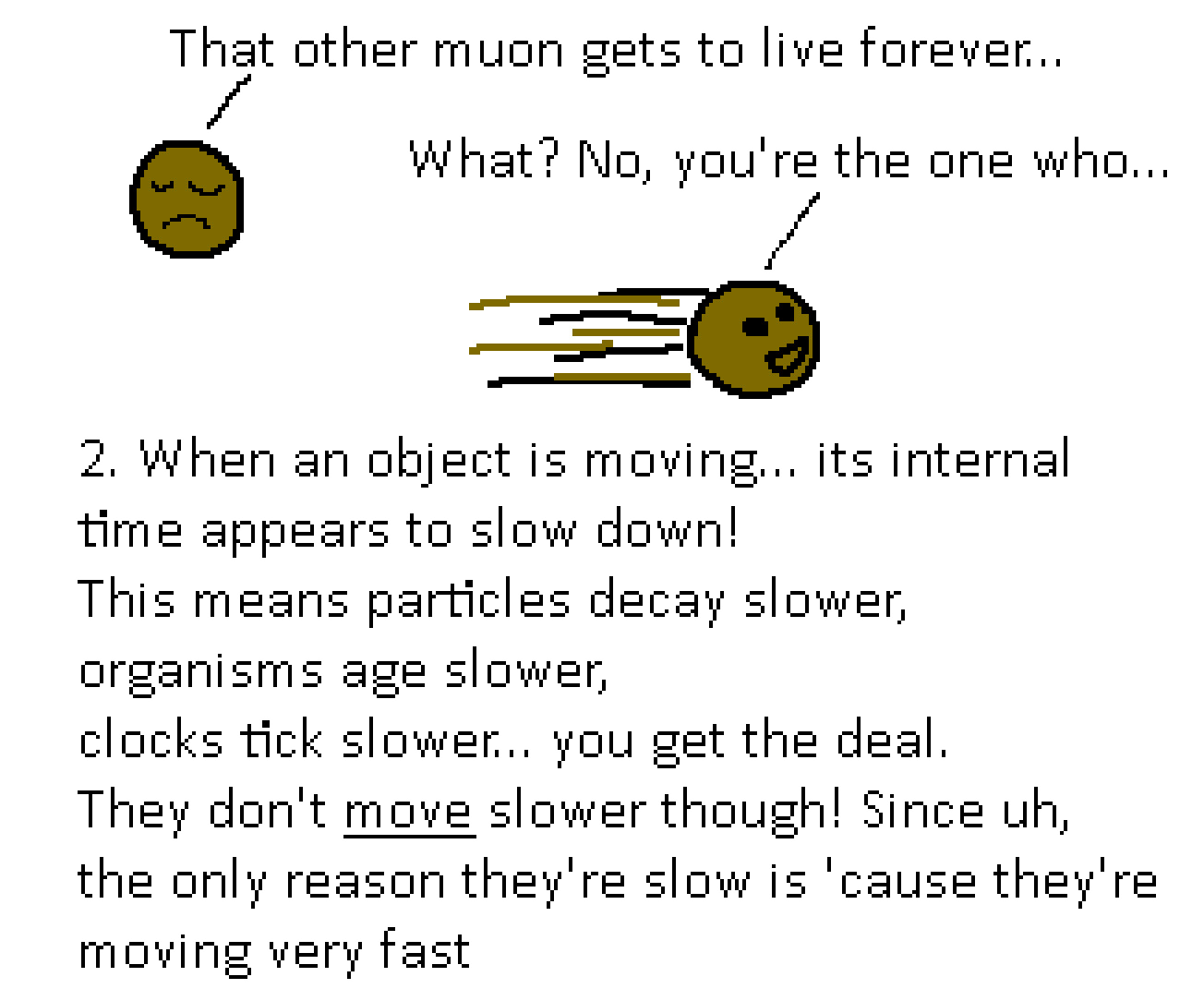 (In the above image, each muon thinks the other muon is moving (both are correct!), so they each see the other muon as having dilated time (still both correct!) and will each see themselves be outlived by the other muon. They disagree about who lived longer, and an outside observer would see them as dying at the same time. The fact that all 3 observers can be correct while disagreeing about the order in which the muons decayed leads us into the final point....)