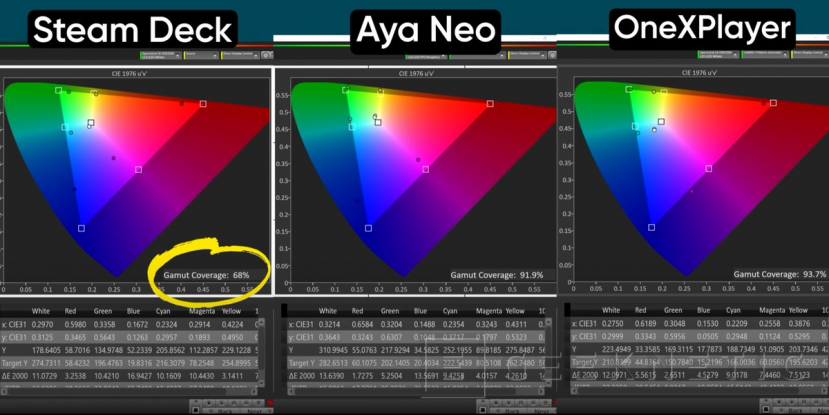 According to the internet, the Deck's display only covers 68% of sRGB, which is somewhat low for a high-end modern device, but gamut is fundamentally not the only factor here in whether the display "looks good"