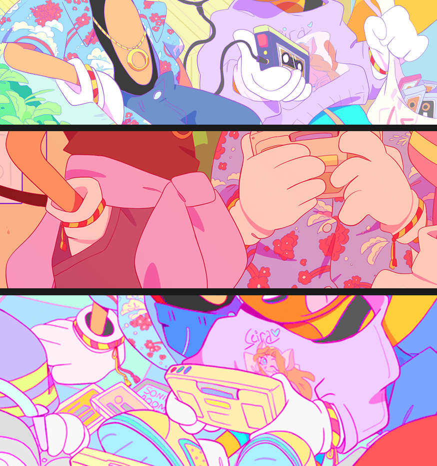 here's a detail that keeps popping up in my drawings -- ray and mighty have matching friendship bracelets, that presumably ray made for the two of them. they can be seen all over the place, basically whenever i draw them in fun outfits. here's screencaps of where they've appeared previously: