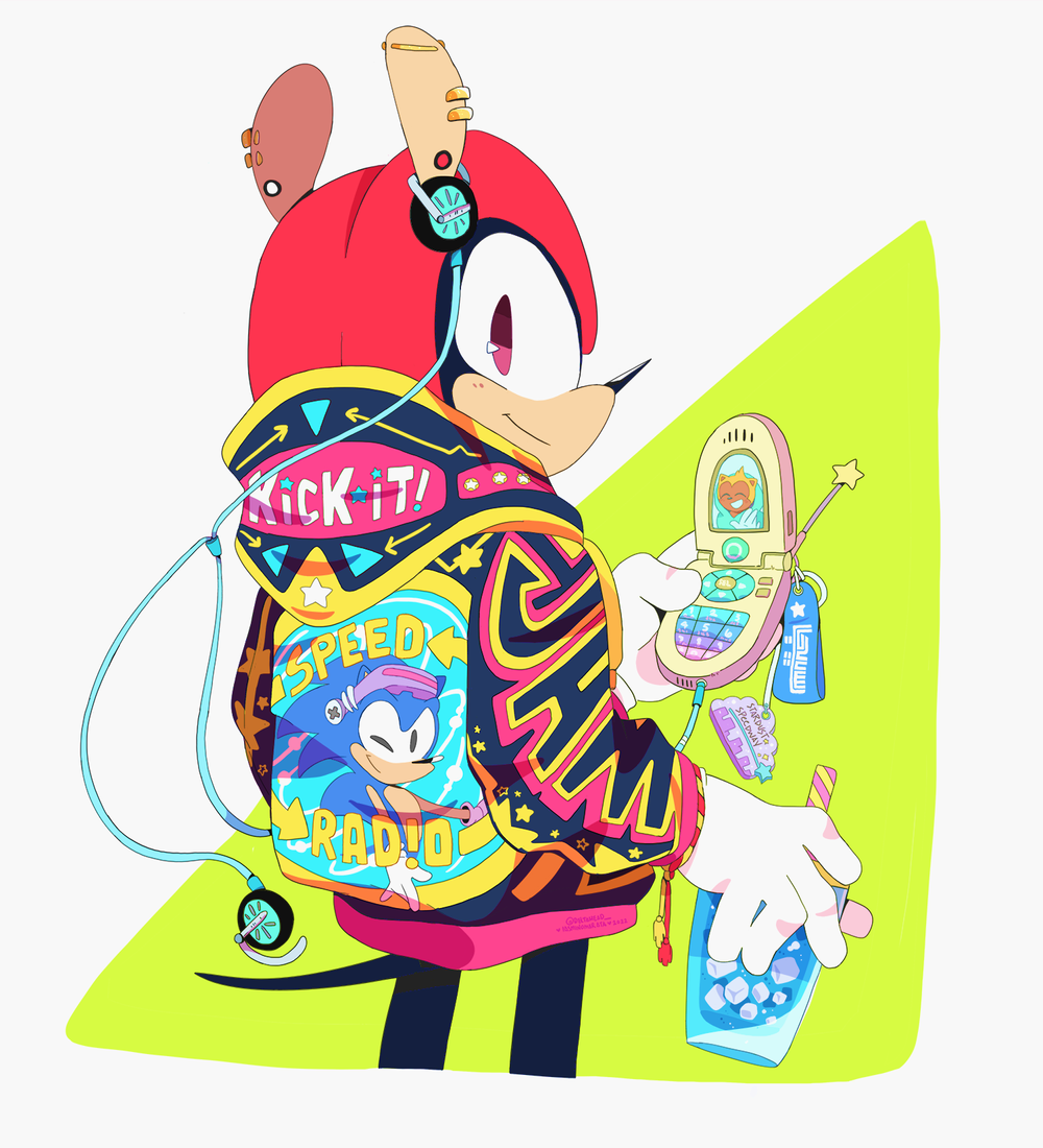 the text KICK IT/JAM text, and sonic's art here, are references to the beloved satoshi okano illustration from the mid-90's that was really influential in modern sonic's design.