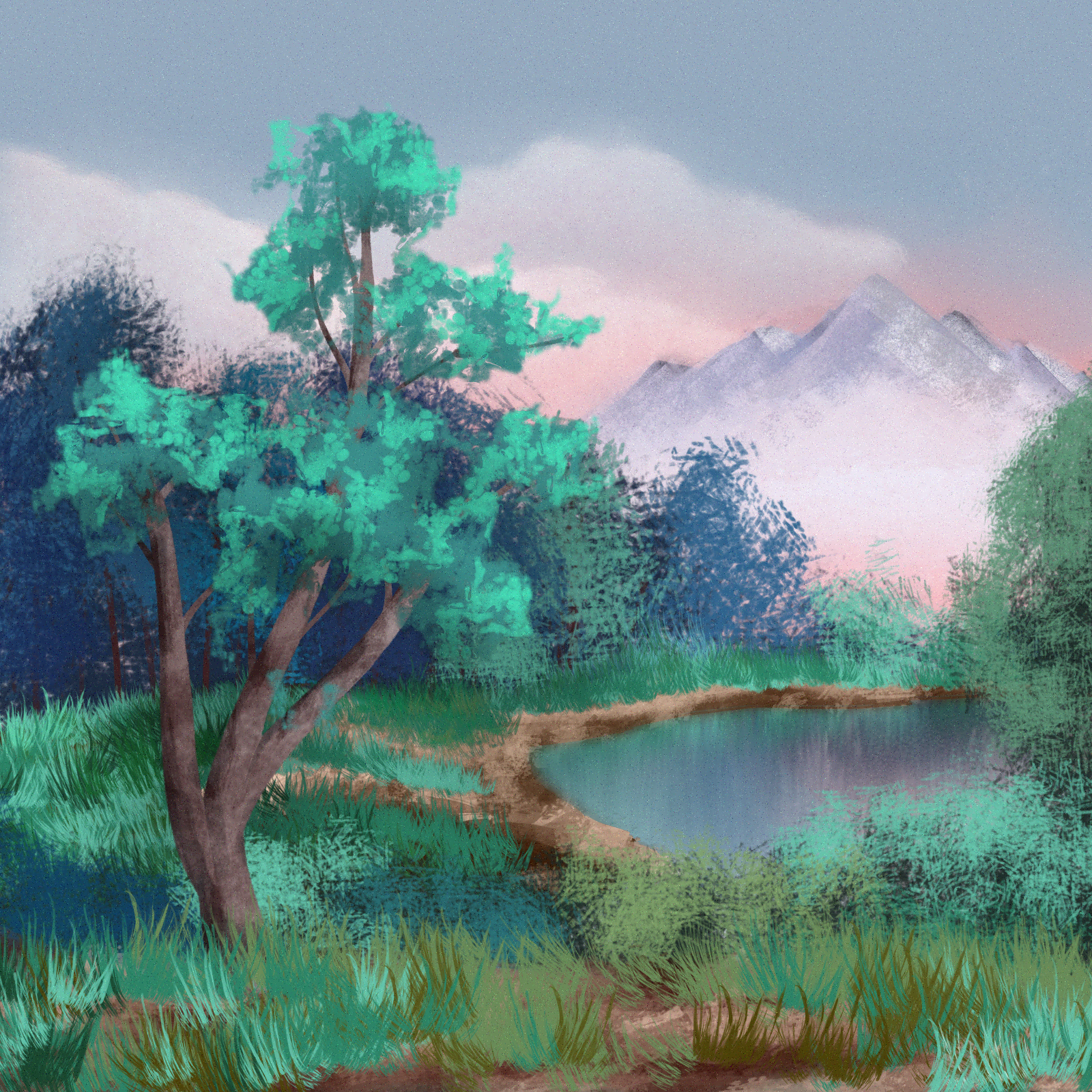 full disclosure i 1. am not superly duperly interested in plant pigmentation biology but this should be close enough to realistic for my liking, 2. these were both the result of me following bob ross tutorials but on a computer and with a mouse. my first and 2nd times ever doing so in fact. i don't remember which episodes specifically though, sorry. i think i did quite well they came out quite nice