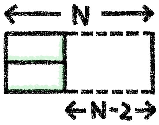 Similarly, if we place a pair of dominoes horizontally at the end of our 2×N rectangle, we’re left with a 2×(N-2) space, which can be filled Fn-2 ways.