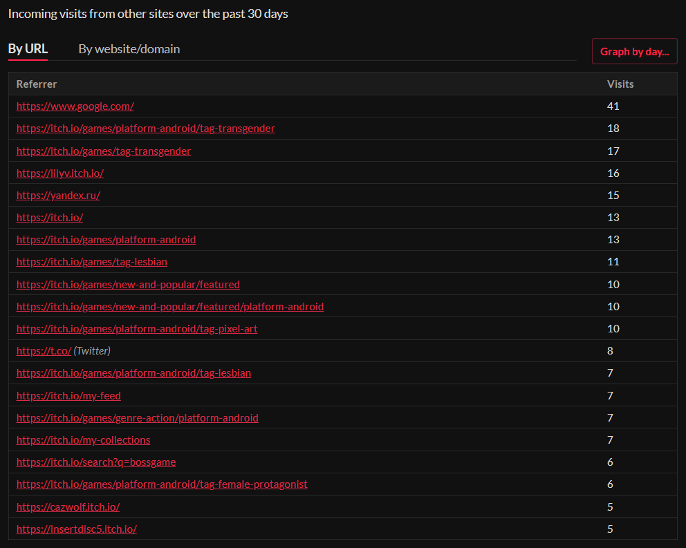 That said, even now (long after the feature is gone) I get a lot of internal traffic from itch, with only Google results beating internal itch links. It seems like it's mostly people searching for specific tags "transgender" "pixel graphics" "android", etc. and people who find it when browsing "View All Featured Games".
