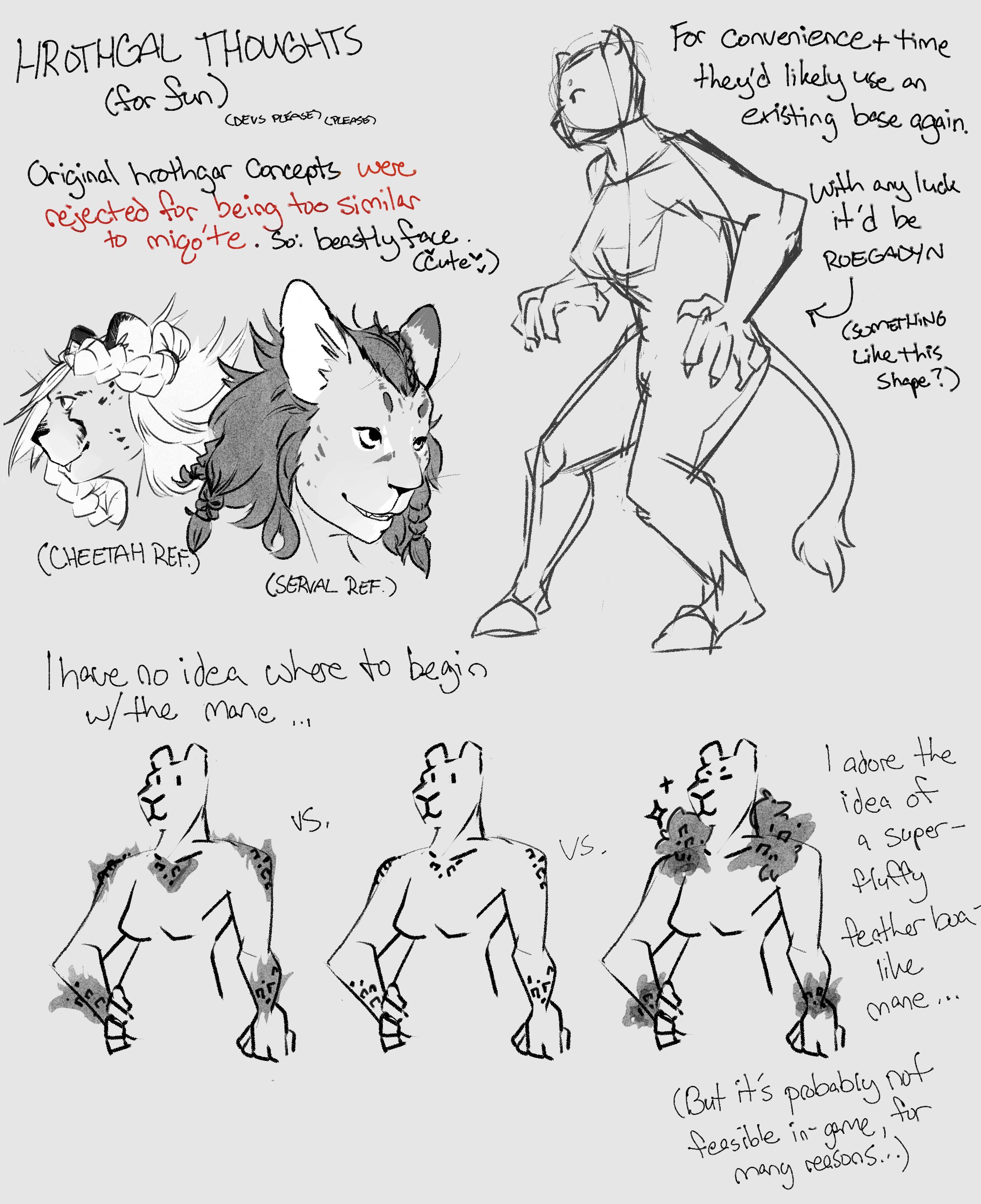 JP Fanfest is approaching at a rapid speed so I'm just vibrating in place with yet unknown emotions. I'm hoping that they'll have cat heads, mostly. Appearance-wise... I actually scribbled out my tempered thoughts on what the devs might do four years ago (one, two), and that's still roughly what I expect. Unfortunately not super bulky, but something lady ronso-ish (FFX) in shape. I do hope they have muscle though, some broad shoulders to at least try for the barrel-chest big cat look...
