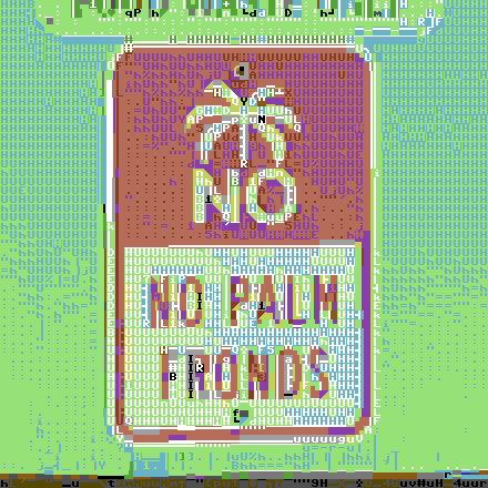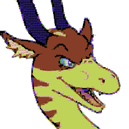 It really loves using the letter H for blending colors when the C64 has a perfectly usable ▒ right there. I know why this happens. It actually doesn't compare all 8x8 pixels when searching for matching characters and color combos. It reduces both the character set and the user image by 50% so that it's comparing 4x4 patches instead.