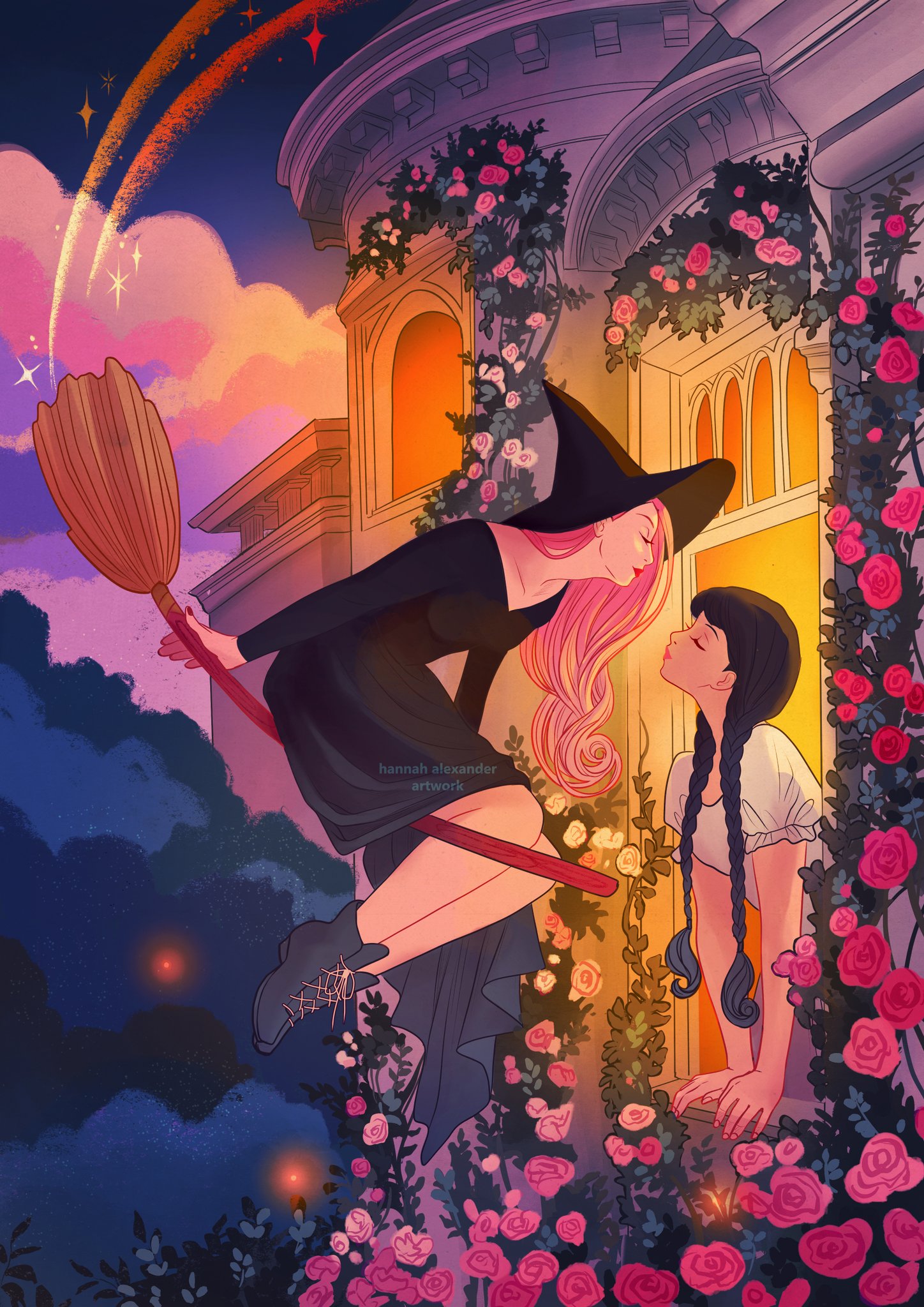 she reaches for the witch's hand as they gaze into the night sky together
