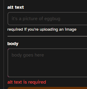 also the alt text field doesn't have any error text (just the X), but the body has the alt text error message lol